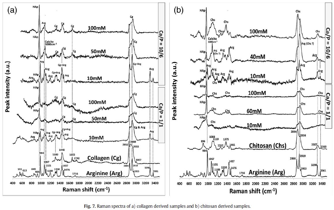 size distribution depend on the precursors’ final concentration with the mean size ranging from 5 nm up to 20 nm. The powder that demonstrated the best characteristics in terms of homogeneity was that produced in the presence of collagen for molar ratio of Ca/P 1/1.
